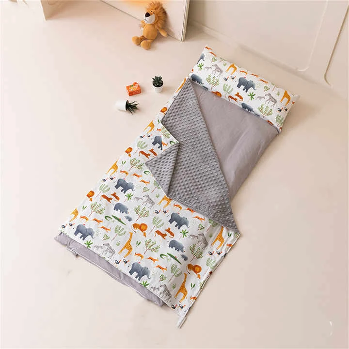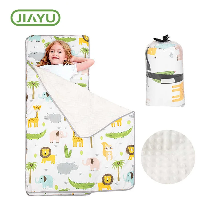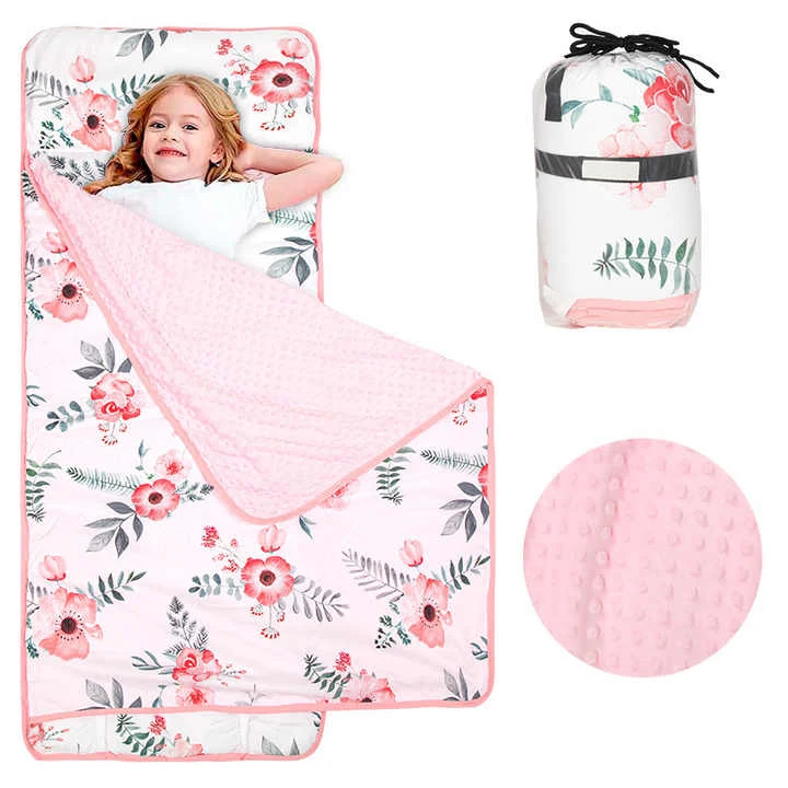 Blauwe peuter camping dutje tas Met het rollup -ontwerp kan de mat gemakkelijk reizen, evenals de handige bevestigingsbanden en de draaggreep.