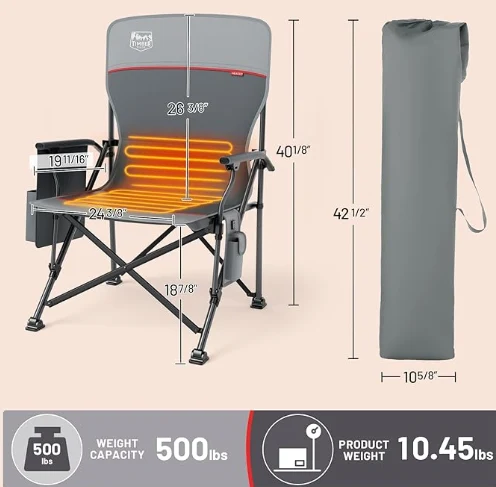 Aangepaste verwarmde vouwstoel, dubbele verwarmingszones voor rug en stoelwarming tot 131 ° F in slechts 10 seconden. Drie warmte -instellingen (104 ° F, 122 ° F, 131 ° F) zorgen voor warmte voor een buitengeleiding (batterij niet inbegrepen).