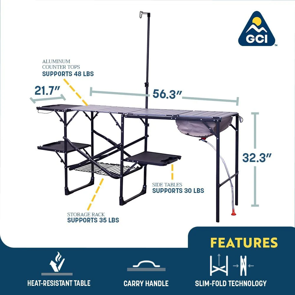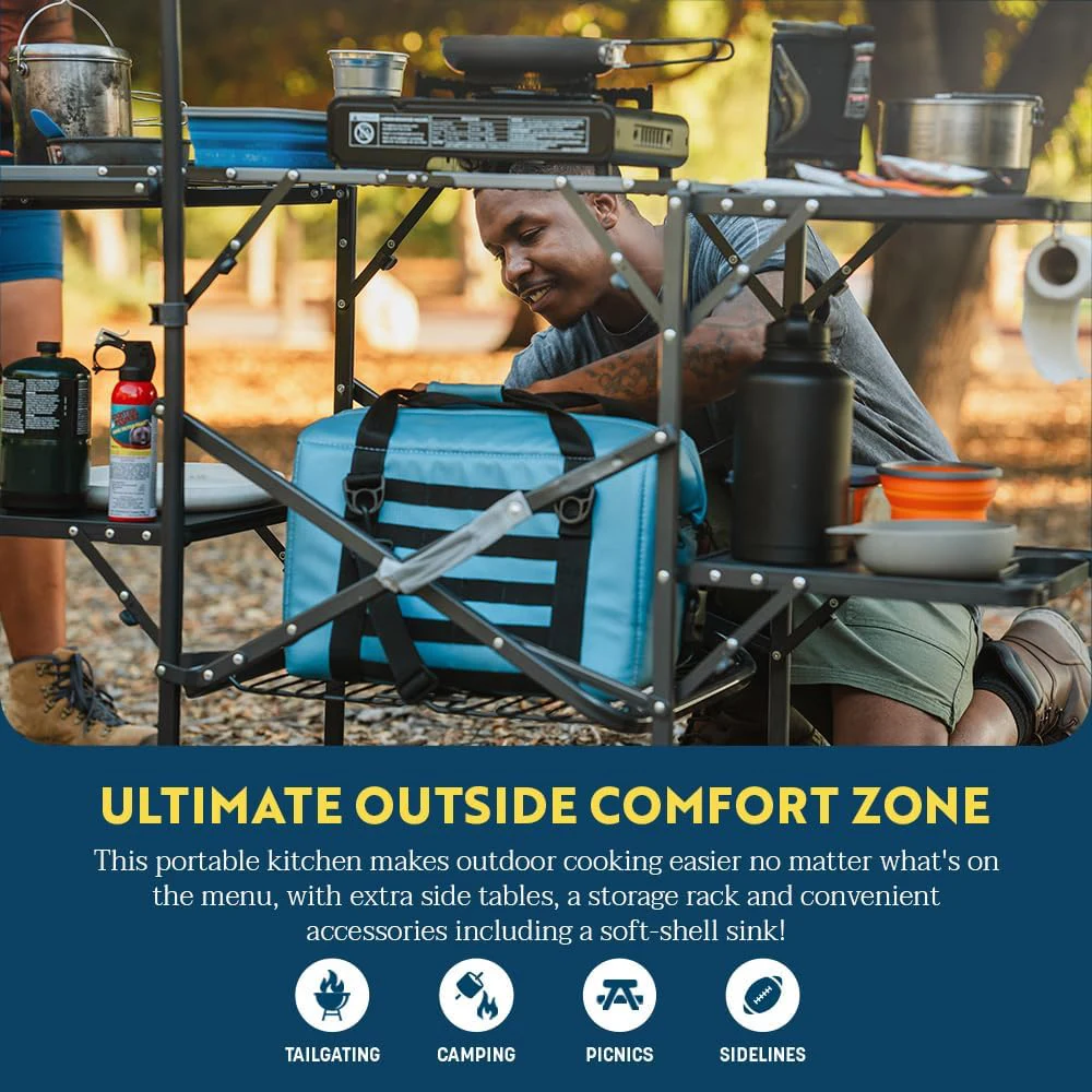 Draagbare opvouwbare aluminium campingtafel, maak je kampreizen episch met het Master Cook Station van GCI Outdoor. Deze draagbare keuken zit boordevol functies (inclusief een soft-shell gootsteen!), Waardoor het de perfecte aanvulling is op je tailgating- of campingbenodigdheden.