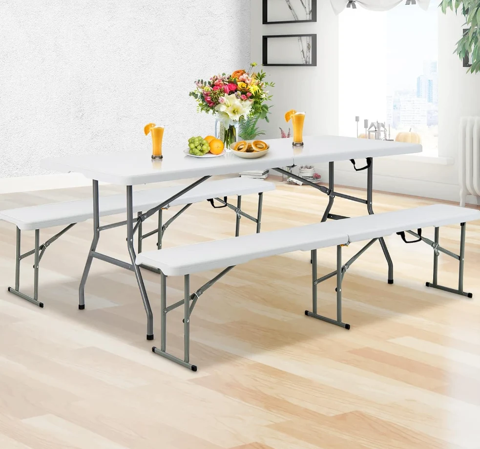 Hoogwaardige buitenkamptafel, witte HDPE witte rechthoekige picknicktafel plastic vouwen buiten campingtafel, biedt ruime ruimte voor het vasthouden van voedsel, desserts, drankjes of snacks. Deze vouwtafel is geschikt voor ongeveer 8 personen om zich te verzamelen voor een familiemaaltijd of feestdiner. En alle hoeken van het tafelblad zijn afgerond om toevallige letsel te voorkomen.