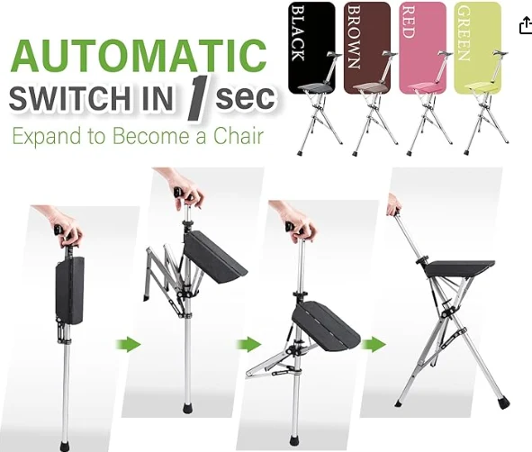 Oude mannen alpenstock trekking riet, rustend en een wandelstick voor ondersteuning. Dit ontwerp, dat onmiddellijk een wandelstok omzet in een stoel met een snap, biedt rust voor vermoeide benen en knieën op een oogwenk.